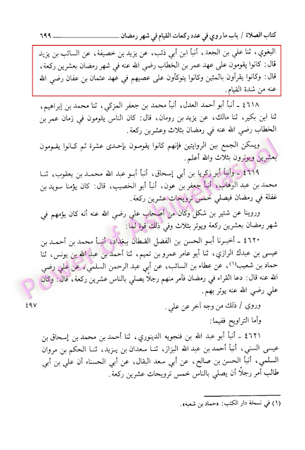 أخبرنا أبو الحسن بن الفضل القطان ببغداد أنبأ محمد بن أحمد بن عيسى بن عبدك الرازي ثنا أبو عامر عمرو بن تميم ثنا أحمد بن عبد الله بن يونس ثنا حماد بن شعيب عن عطاء بن السائب عن أبي عبد الرحمن السلمي عن على رضي الله عنه قال دعا القراء في رمضان فأمر منهم رجلا يصلي بالناس عشرين ركعة قال وكان علي رضي الله عنه يوتر بهم وروى ذلك من وجه آخر عن علي